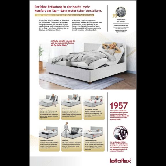 „Denken Sie daran : Ihr Bett können Sie austauschen- Ihren Rücken nicht! Erleben Sie selbst, was Lattoflex für Sie tun kann.Gerne können wir einen Termin bei Ihnen zu Hause vereinbaren, um Ihnen Lattoflex näher zu bringen.“