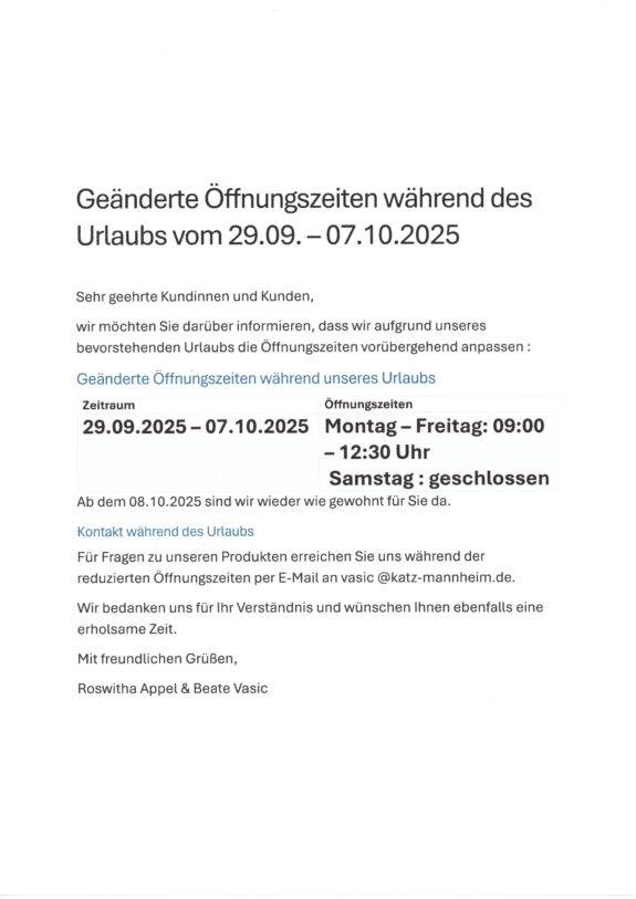 Aktuelles : geänderte Öffnungszeiten