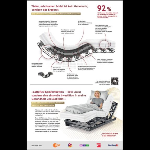 „Denken Sie daran : Ihr Bett können Sie austauschen – Ihren Rücken nicht! Erleben Sie selbst, was Lattoflex für Sie tun kann ! Gerne können wir einen Termin bei Ihnen zu Hause vereinbaren, um Ihnen Lattoflex näher zu bringen.“
