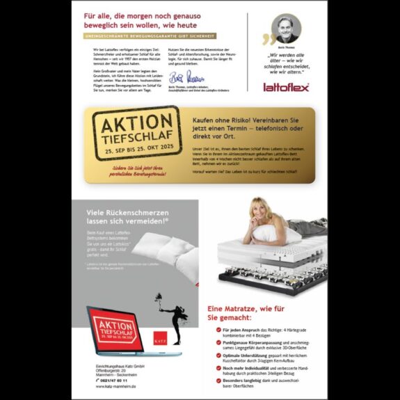 „Unser Ziel ist es, Ihnen den besten Schlaf Ihres Lebens zu schenken.Das nennen wir die “ Lattolfex – Bewegungsgarantie“! Aber nur vom 25.09.2025 – 25.10.2025 .“