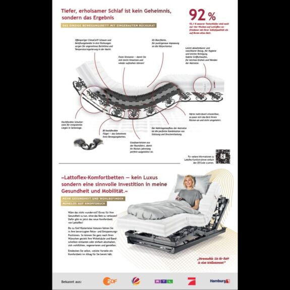 „Denken Sie daran : Ihr Bett können Sie austauschen – Ihren Rücken nicht! Erleben Sie selbst, was Lattoflex für Sie tun kann ! Gerne können wir einen Termin bei Ihnen zu Hause vereinbaren, um Ihnen Lattoflex näher zu bringen.“