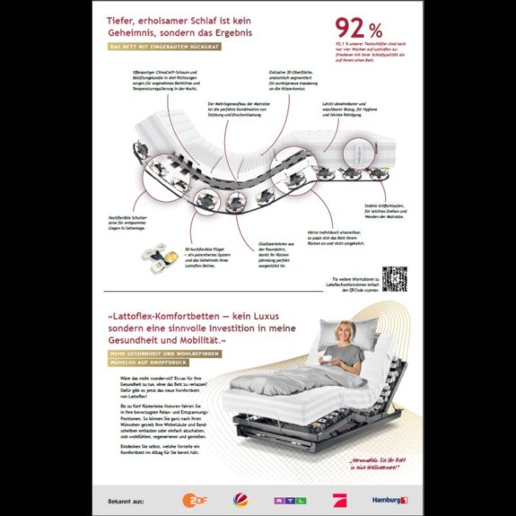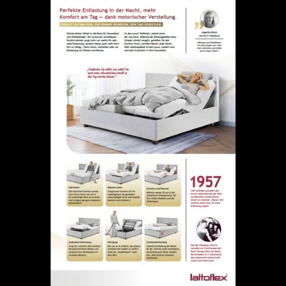 „Denken Sie daran : Ihr Bett können Sie austauschen – Ihren Rücken nicht! Erleben Sie selbst was Lattoflex für Sie tun kann! Gerne können wir einen Termin bei Ihnen zu Hause vereinbaren , um IhnenLattoflex näher zu bringen.“