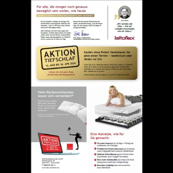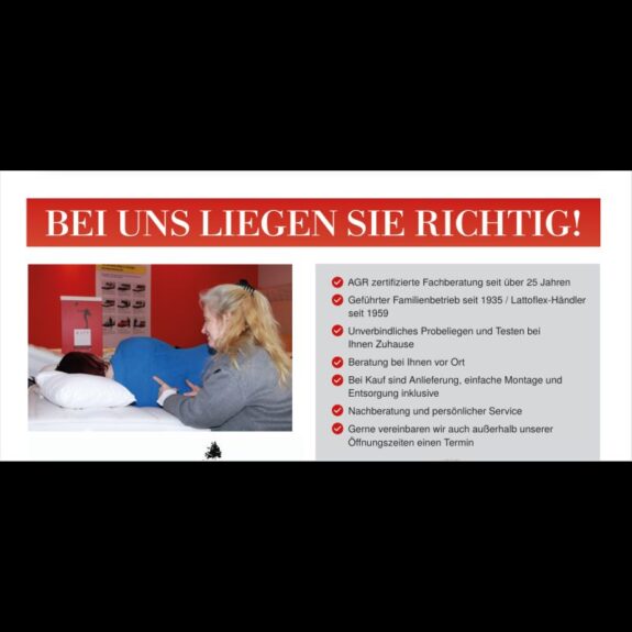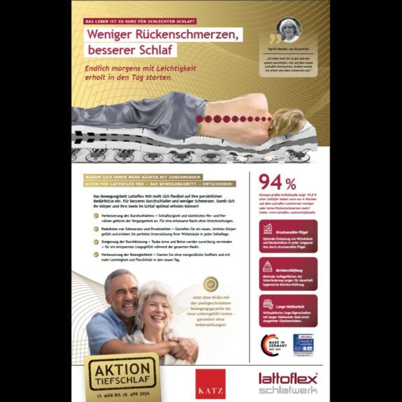 „Unser Ziel ist es, Ihnen den besten Schlaf Ihres Lebens zu schenken. Das nennen wir die “ Lattoflex Bewegungsgarantie“!Aber nur vom 13.März 2026 – 18. April 2026.„